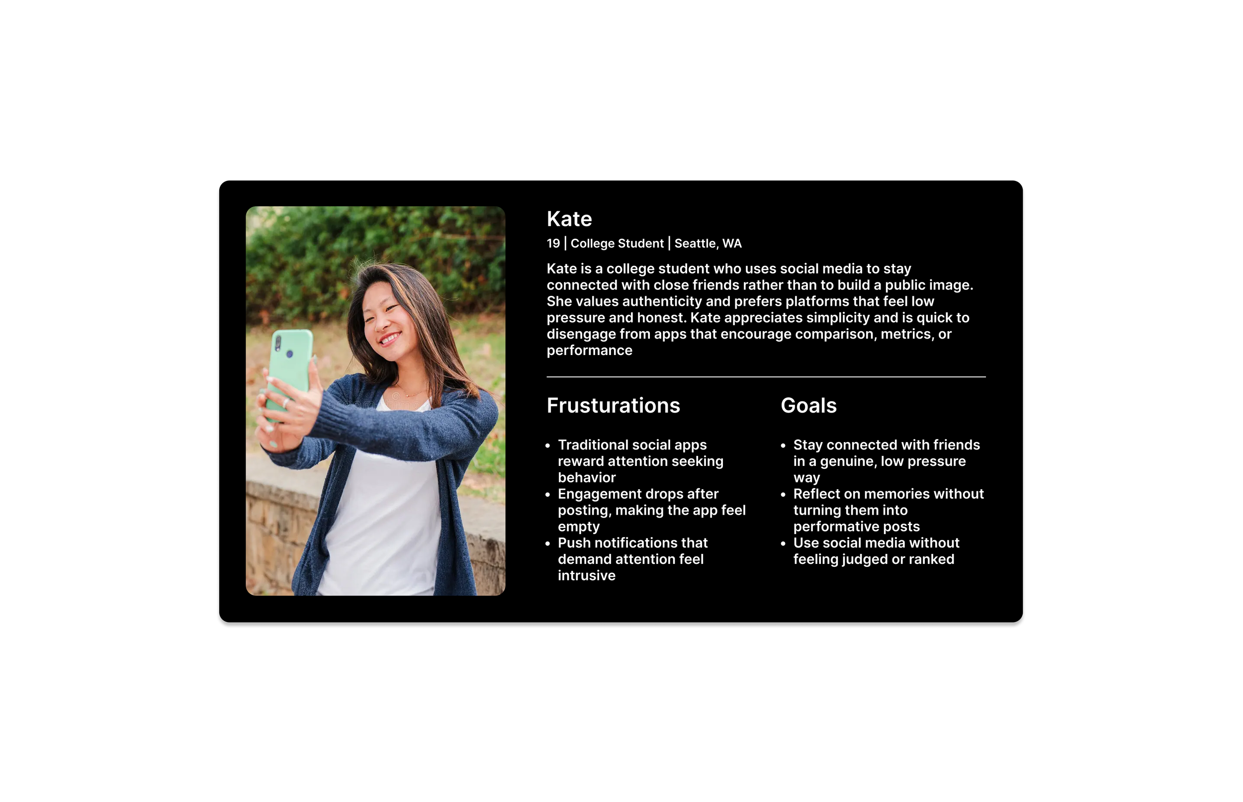 Because ~43% of BeReal’s users are ages 16–25, the research focused on this demographic with 10 participants through surveys and interviews to identify engagement drop-off moments and understand what motivates low-effort participation