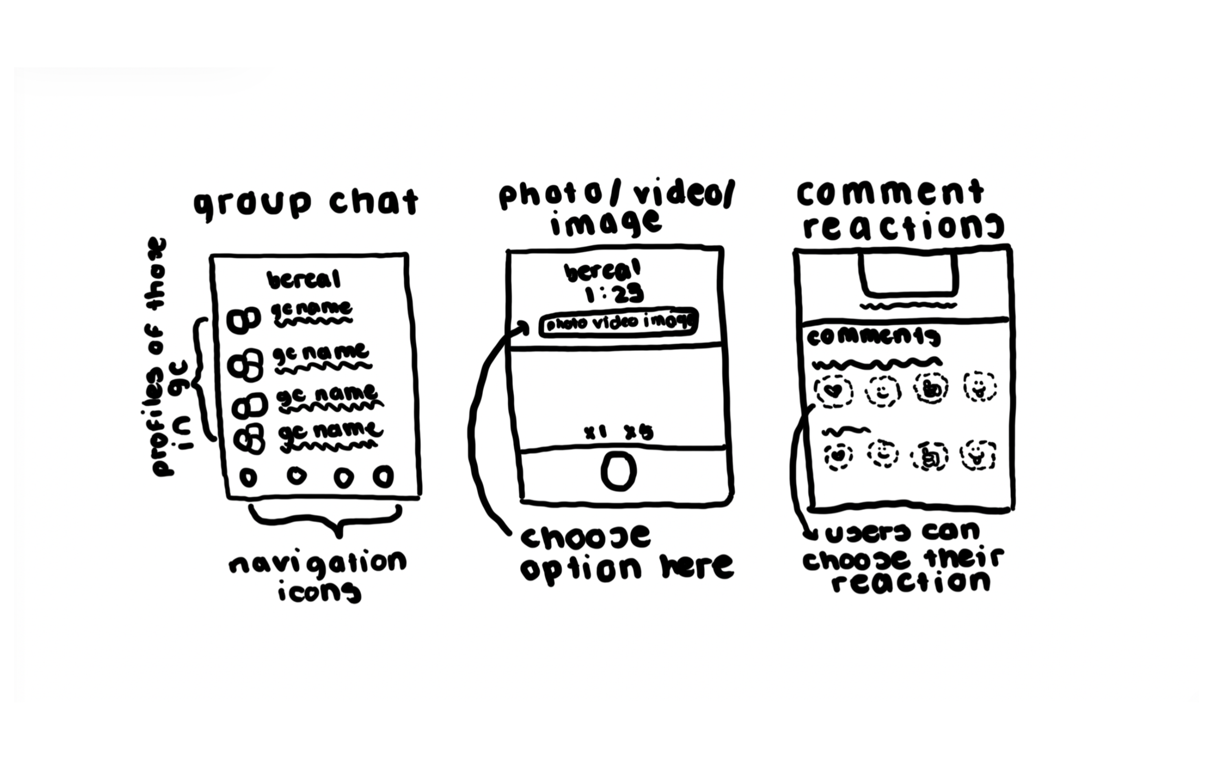 Before opening Figma, I explored multiple concepts using paper sketches. This phase helped identify high-potential concepts early, reducing wasted design time and ensuring alignment with BeReal’s user-first philosophy